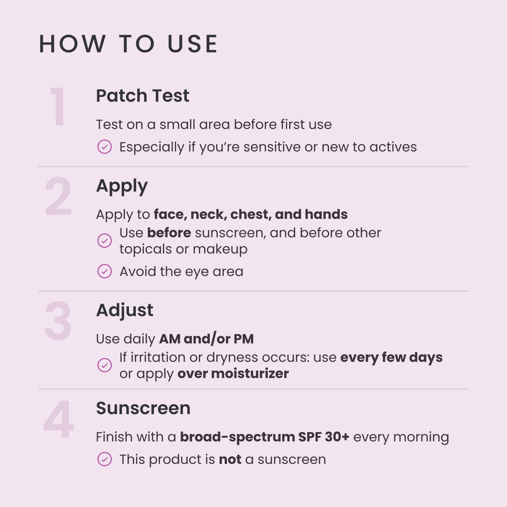 A test patch is recommended before use. Apply to face, neck, chest and hands before applying sunscreen and before other topicals or makeup. If irritation occurs, apply only every few days or over moisturizer. Use daily in the morning and/or evening.